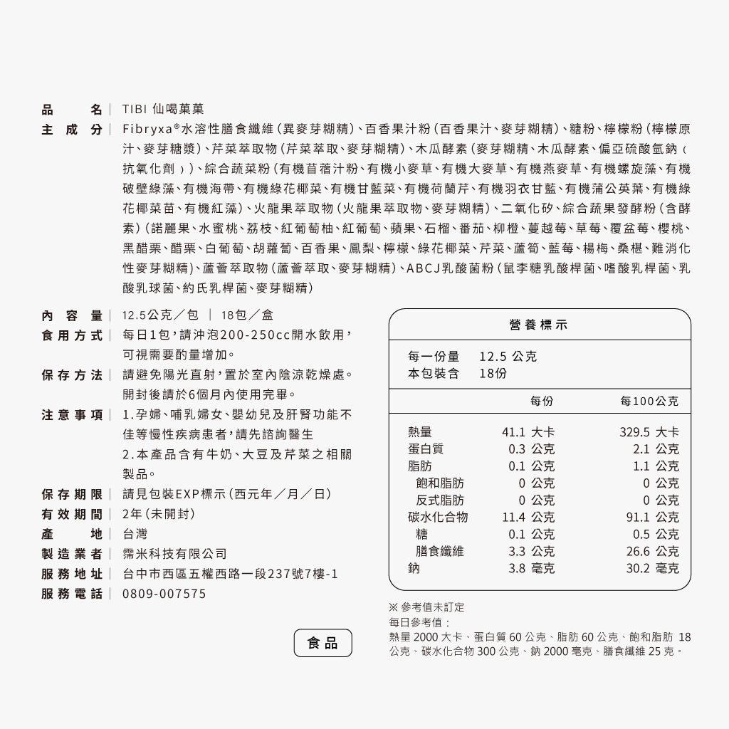主成分│Fibryxa®水溶性膳食纖維(異麥芽糊精)、百香果汁粉(百香果汁、麥芽糊精)、糖粉、檸檬粉(檸檬原汁、麥芽糖漿)、芹菜萃取物(芹菜萃取、麥芽糊精)、木瓜酵素(麥芽糊精、木瓜酵素、偏亞硫酸氫鈉﹙抗氧化劑﹚)、綜合蔬菜粉(有機苜蓿汁粉、有機小麥草、有機大麥草、有機燕麥草、有機螺旋藻、有機破壁綠藻、有機海帶、有機綠花椰菜、有機甘藍菜、有機荷蘭芹、有機羽衣甘藍、有機蒲公英葉、有機綠花椰菜苗、有機紅藻)、火龍果萃取物(火龍果萃取物、麥芽糊精)、二氧化矽、綜合蔬果發酵粉(含酵素)(諾麗果、水蜜桃、荔枝、紅葡萄柚、紅葡萄、蘋果、石榴、番茄、柳橙、蔓越莓、草莓、覆盆莓、櫻桃、黑醋栗、醋栗、白葡萄、胡蘿蔔、百香果、鳳梨、檸檬、綠花椰菜、芹菜、蘆筍、藍莓、楊梅、桑椹、難消化性麥芽糊精)、蘆薈萃取物(蘆薈萃取、麥芽糊精)、ABCJ乳酸菌粉(鼠李糖乳酸桿菌、嗜酸乳桿菌、乳酸乳球菌、約氏乳桿菌、麥芽糊精)