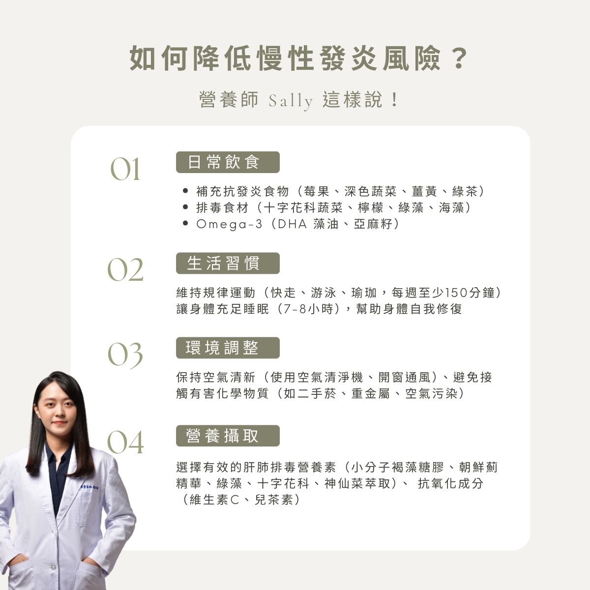透過 抗發炎飲食、規律運動、環境調整,並搭配 有效的肝肺排毒營養補充,可以幫助身體加速排毒、減少發炎,讓你擁有更好的能量與免疫力!