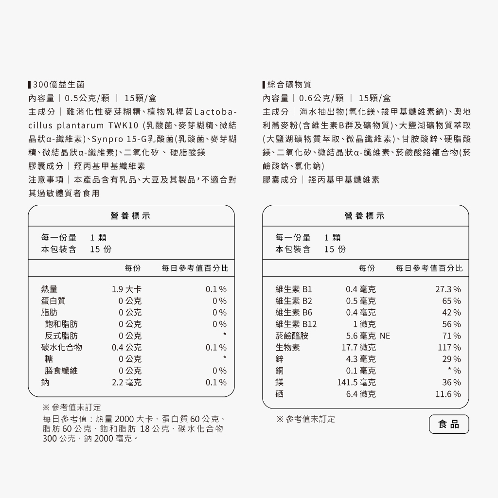 內容量:0.5公克/顆|15顆/盒|主成分:難消化性麥芽糊精、植物乳桿菌Lactobacillus plantarum TWK10 (乳酸菌、麥芽糊精、微結晶狀α-纖維素)、Synpro 15-G乳酸菌(乳酸菌、麥芽糊精、微結晶狀α-纖維素)、二氧化矽 、 硬脂酸鎂|膠囊成分:羥丙基甲基纖維素|注意事項:本產品含有乳品、大豆及其製品,不適合對其過敏體質者食用