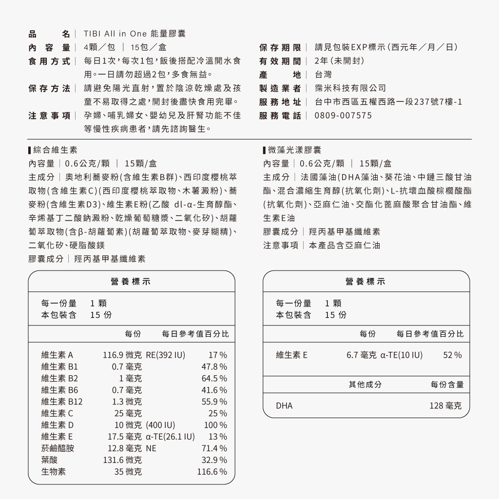 內容量:0.6公克/顆|15顆/盒|主成分:奧地利蕎麥粉(含維生素B群)、西印度櫻桃萃取物(含維生素C)(西印度櫻桃萃取物、木薯澱粉)、蕎麥粉(含維生素D3)、維生素E粉(乙酸dl-α-生育醇酯、辛烯基丁二酸鈉澱粉、乾燥葡萄糖漿、二氧化矽)、胡蘿蔔萃取物(含β-胡蘿蔔素)(胡蘿蔔萃取物、麥芽糊精)、二氧化矽、硬脂酸鎂|膠囊成分:羥丙基甲基纖維素