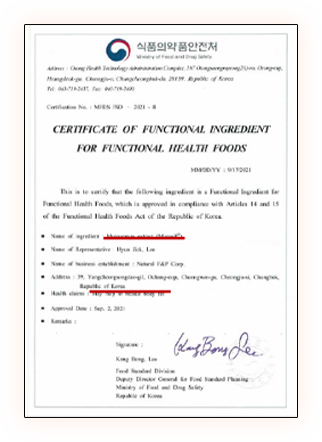 獲得韓國MFDS食品醫藥安全處 【健康機能性食品成分證書】