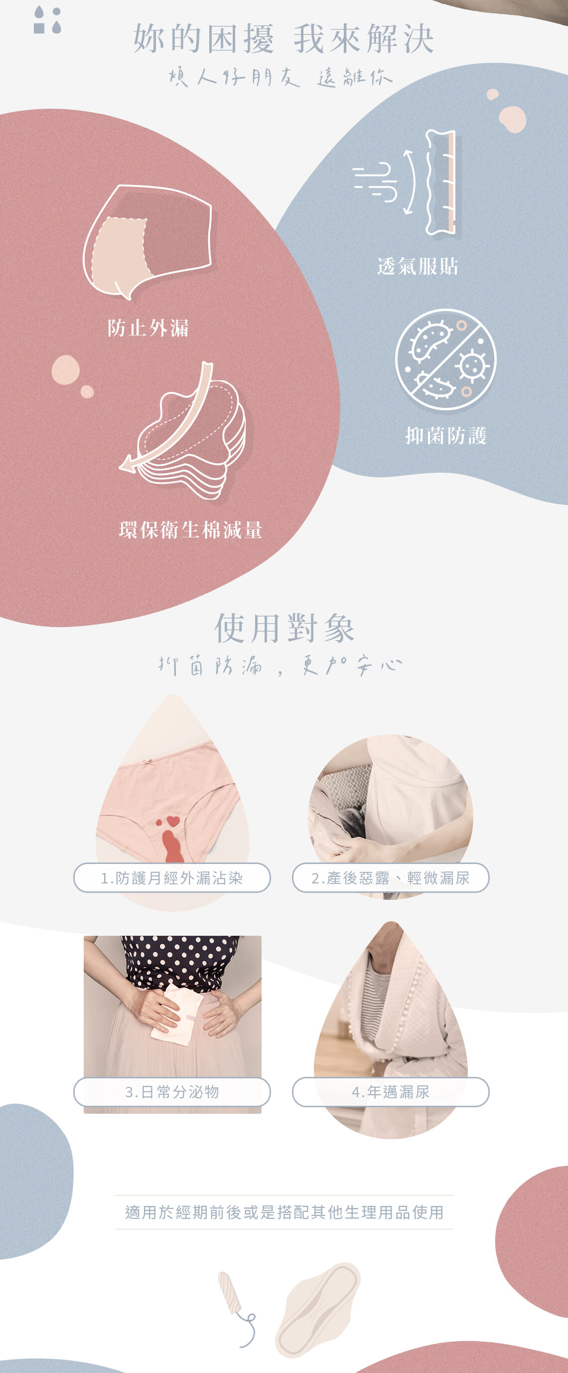 • 生理期、產後惡露、輕微漏尿、白帶分泌物、輕熟女、銀髮族、孕媽咪