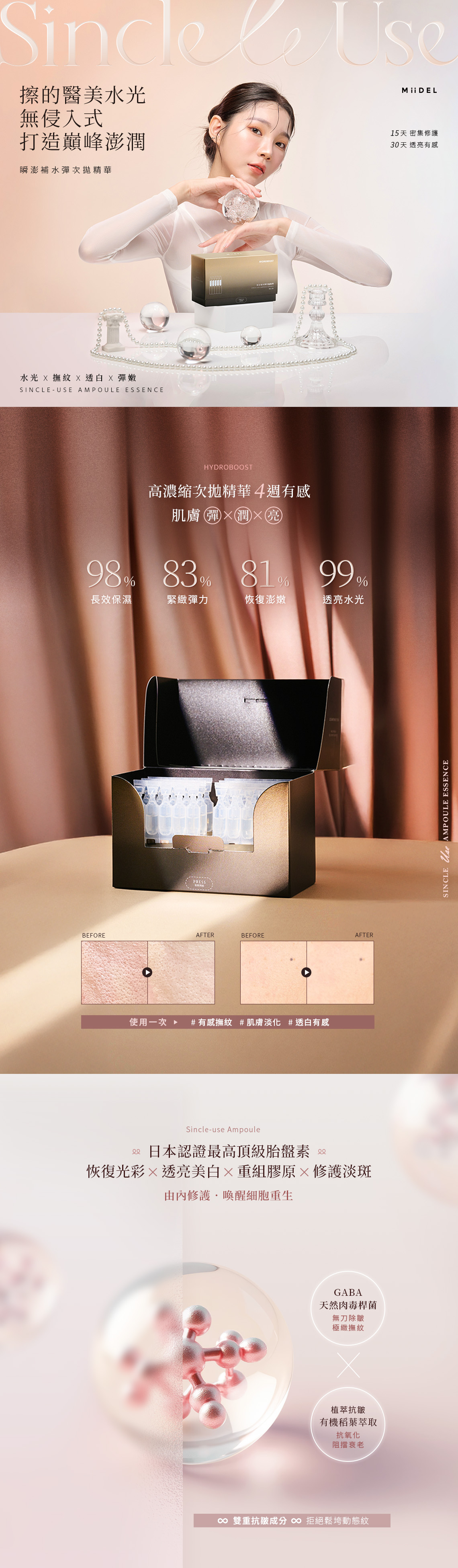 - 爆炸補水 X 緊緻 X 透白水光 X 再現彈嫩