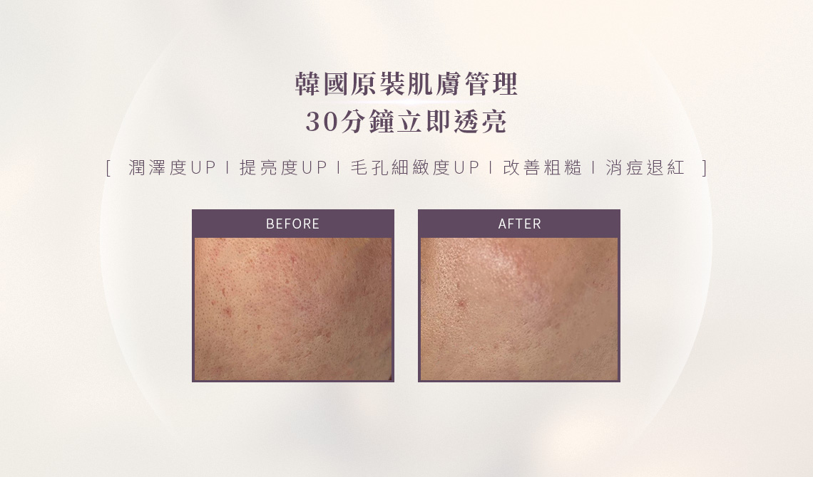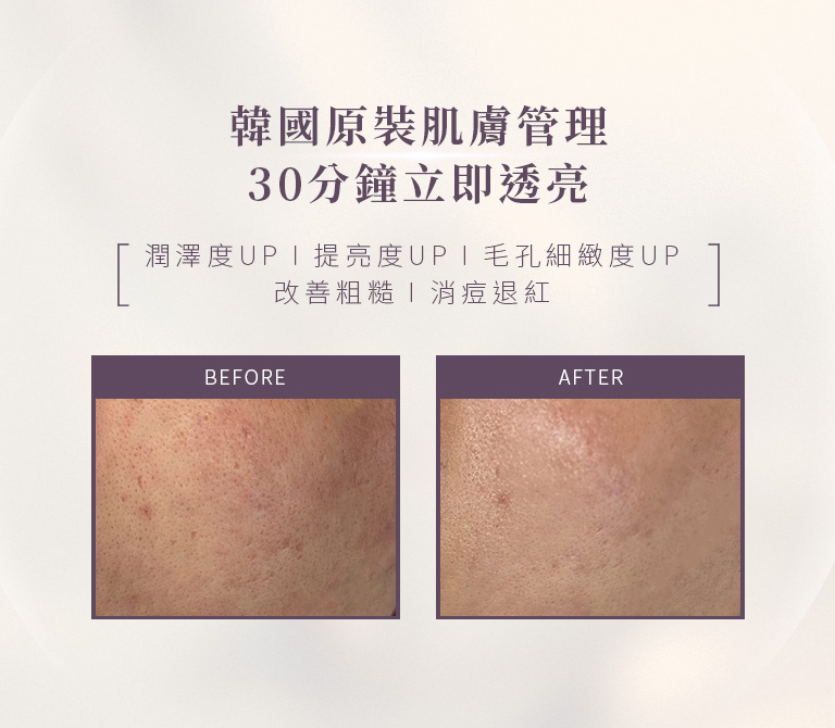 臉部清潔完畢,使用化妝水&精華液後,取適量美容液於掌心揉開,以雙手手掌包覆臉頸處,輕輕按摩肌膚直到完全吸收。