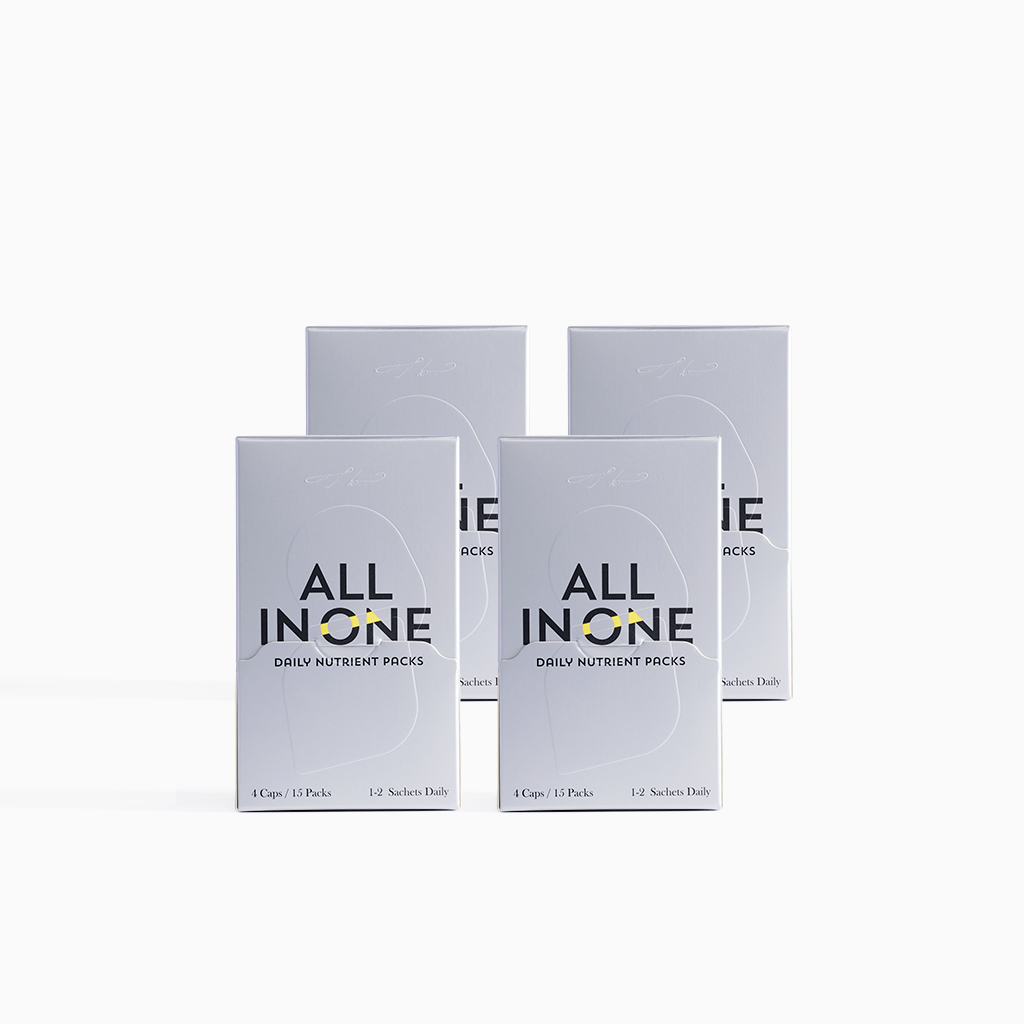 ALL IN ONE 能量膠囊濃縮每日營養,一包 4 顆即可替代市售 4-5 種保健品,對於保養新手吃 ALL IN ONE 能量膠囊即可,保健老手可靈活搭配額外補充。