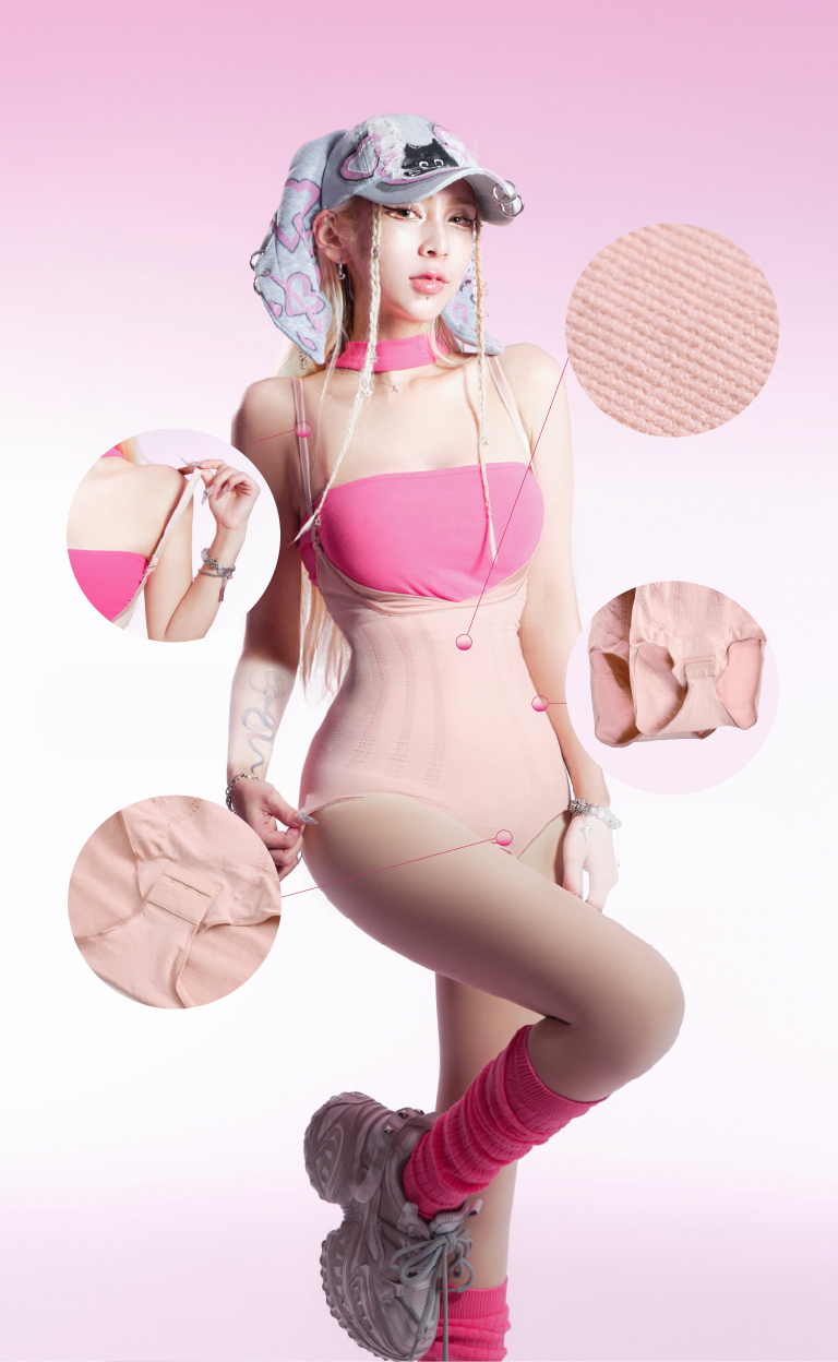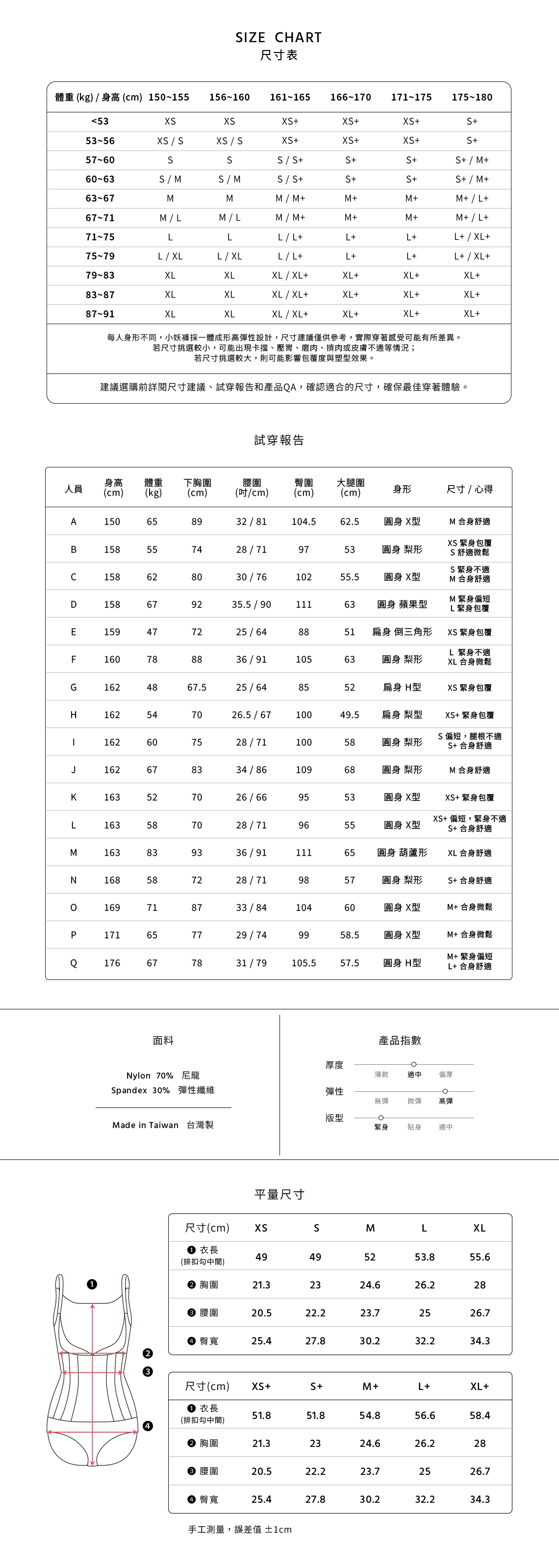 結合高彈性、高延展性、高支撐度,一穿記憶個人身型,修飾塑形曲線,顛覆傳統塑身衣的緊迫不適,打造彈性適壓的精緻雕塑。
