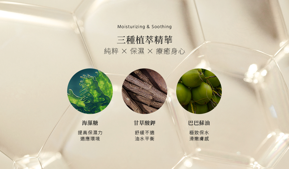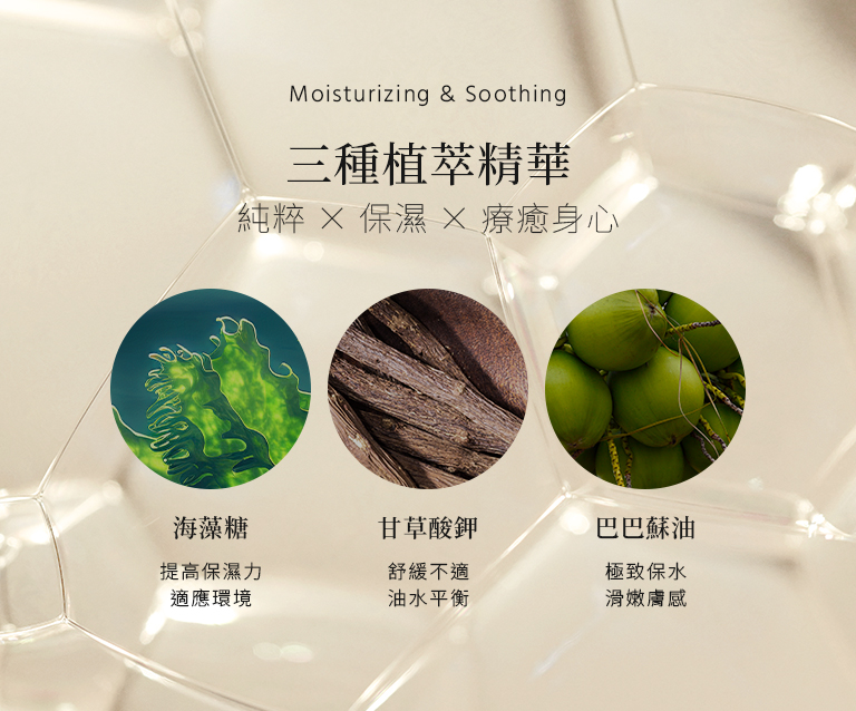 - 深層滋潤|海藻糖、甘草酸鉀、巴巴酥油