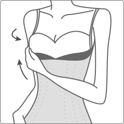 將上半布片調整至下胸圍處讓胸托片在胸部兩側下方,使用雙手將副乳撥至中心調整好胸型。